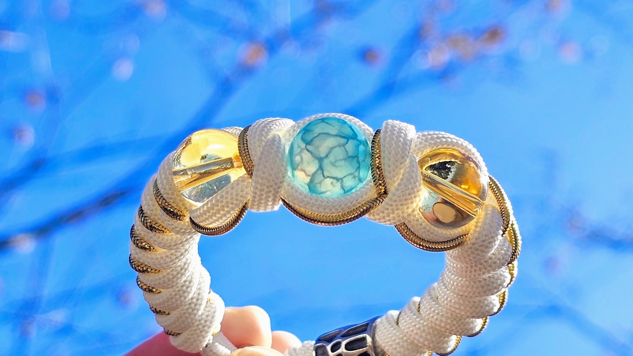 The MITSUBOSHI Bracelet draws its inspiration from Orion’s Belt shining in the night sky, and the mystical force of the Japanese Dragon Spirit.It is crafted with traditional Japanese chirimen patterned cord and strong paracord, carefully handwoven by creator M with heartfelt precision.